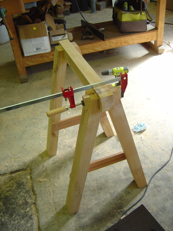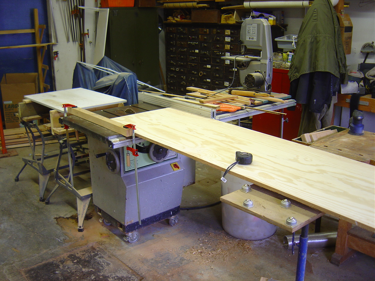 I clamped the table top to my new sawhorses and put the temporary straight fence on to try it out. It proved to be quite functional.