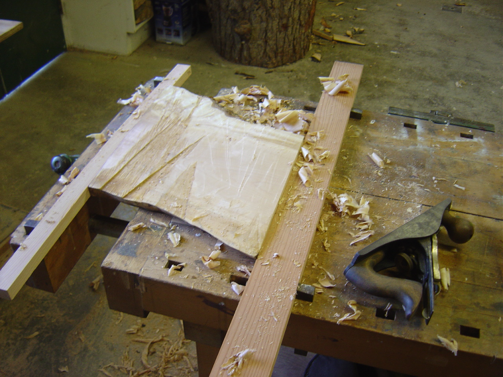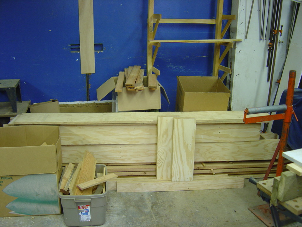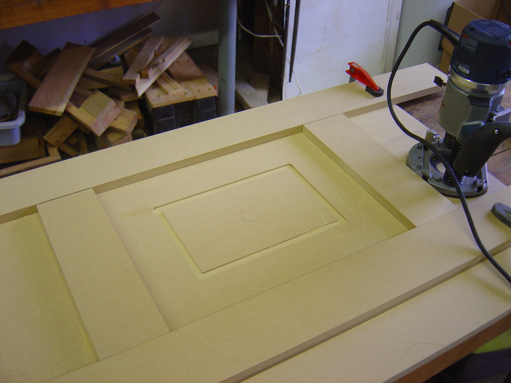 I have to make a router table to put the bead and cove edges on the strips once they’re cut. But as I was getting the parts made up for it, I realized that to rebate the bottom edge of the router plate I made would be best done on a router table. So I made a very crude router ‘platform’ to do that operation. Table is too grandiose a description for what you see above. It’s all made out of chunks from the scrap bin.