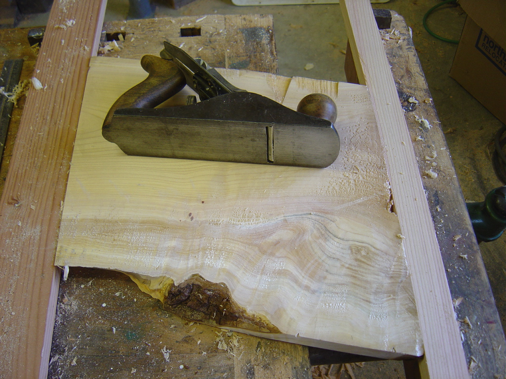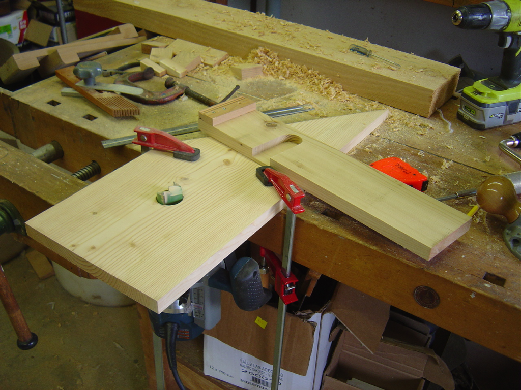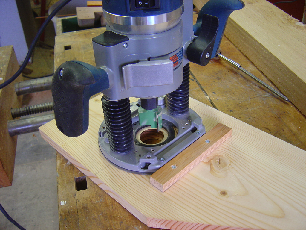 My plunge base is just screwed to a 10″ wide board with a small fence to help me get the alignment right. Then I put in a big 1-1/2″ bit and plunged through the board. The whole thing got turned upside down and bolted to the bench with a face vise supporting the outside edge. Then I planed a small chunk of cedar, stapled a guide to it to keep it square and ran it over the bit to make a fence.